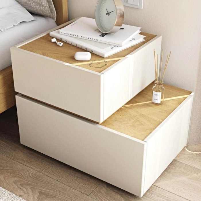Το κομοδίνο είναι διαθέσιμο στο χρώμα Cream Beige (M.11.1) και σε δύο διαστάσεις, 60 εκ. και 50 εκ. Δείτε εδώ το διαθέσιμο χρωματολόγιο. Το κομοδίνο διαθέτει δύο συρτάρια αποθήκευσης, διαφορετικού μεγέθους μεταξύ τους, το εσωτερικό των οποίων είναι κατασκευασμένο από ανάγλυφη μελαμίνη σε linen beige χρώμα. Οι μηχανισμοί των συρταριών είναι ρόδας Teflon, ιταλικής προέλευσης για άριστη λειτουργία σε βάθος χρόνου με ιδιαίτερη αντοχή στο βάρος, ενώ πολύ εύκολα μπορούν να τοποθετηθούν μηχανισμοί soft close για αθόρυβη λειτουργία. Μπορείτε πολύ εύκολα να αναβαθμίσετε το προϊόν και την καθημερινότητα σας επιλέγοντας τον προτεινόμενο usb charger για γρήγορη και εύκολη φόρτιση των ηλεκτρονικών σας συσκευών.