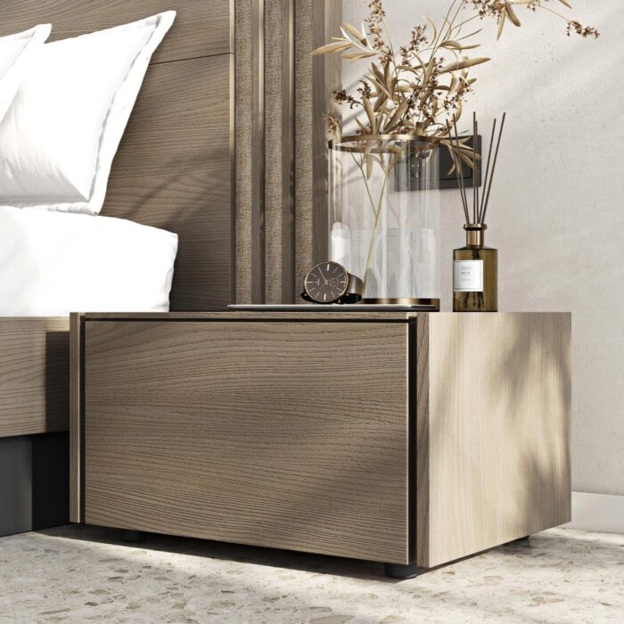 Υπάρχει δυνατότητα προσθήκης soft close μηχανισμών για αθόρυβη λειτουργία. Το κομοδίνο διαθέτει 1 μεγάλο συρτάρι αποθήκευσης και το εσωτερικό του είναι δίχρωμο κατασκευασμένο από ανάγλυφη μελαμίνη. Προαιρετικά μπορούν να ενσωματωθούν διαφόρων ειδών usb φόρτισης.