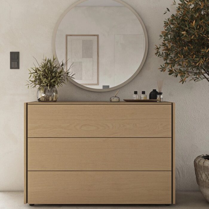 Η συρταριέρα Cliff είναι κατασκευασμένη από φυσικό καπλαμά δρυς. Μπορείτε να επιλέξετε από τα 11 προσεκτικά επιλεγμένα χρώματα φυσικού καπλαμά δρυς. Δείτε εδώ το διαθέσιμο χρωματολόγιο. Διαθέτει 3 μεγάλα συρτάρια αποθήκευσης ίδιου μεγέθους. Ο φυσικός δρύινος καπλαμάς, έχει ιδιαίτερα χαρακτηριστικά νερά, που διαφοροποιούνται ανάλογα με το τμήμα του κορμού του δένδρου που χρησιμοποιήθηκε, αναδεικνύοντας τη φυσική του ομορφιά.