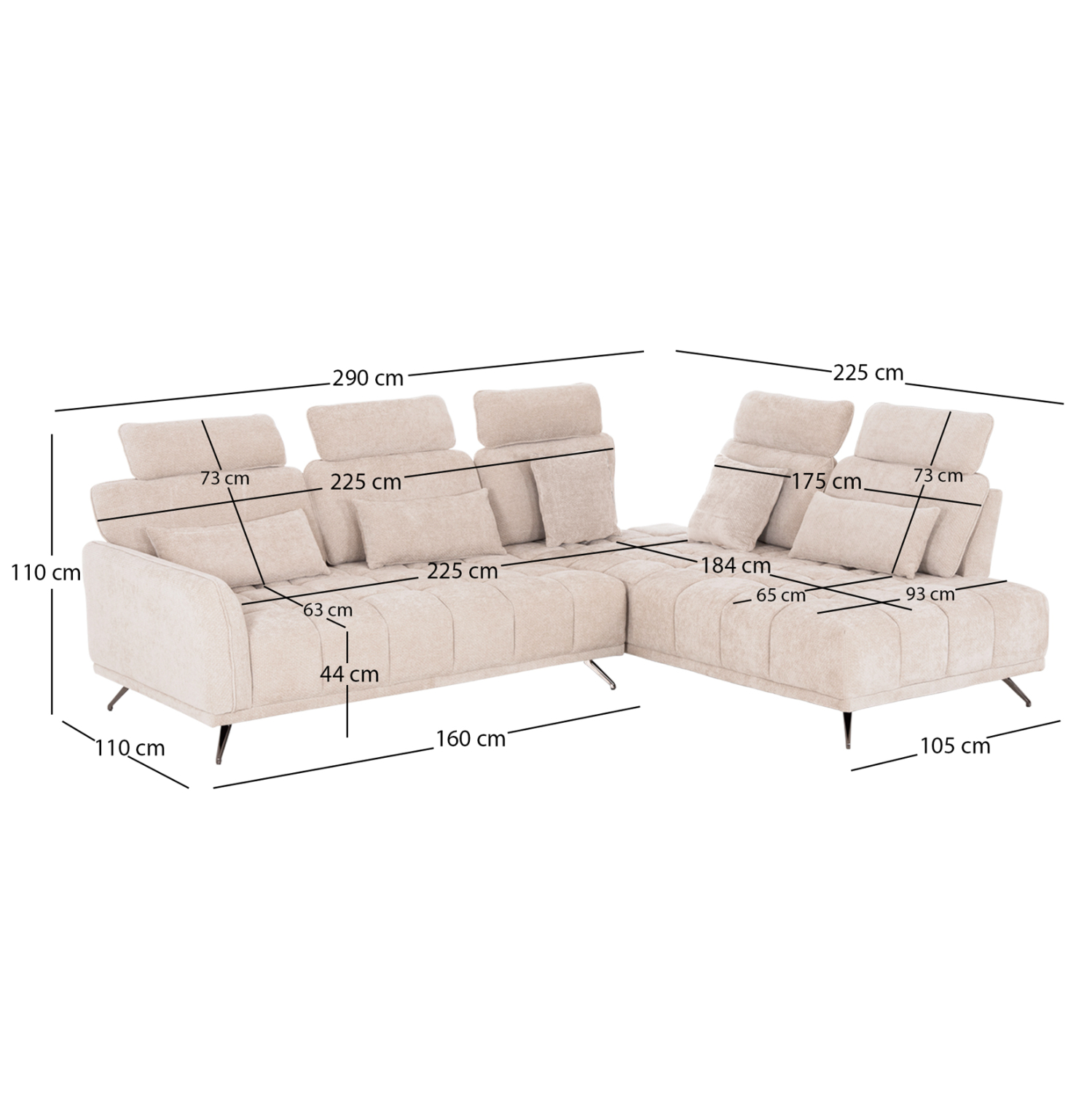 Διαστάσεις καθίσματος: 225(160)x63-184 εκ. & 65-105×184 εκ.