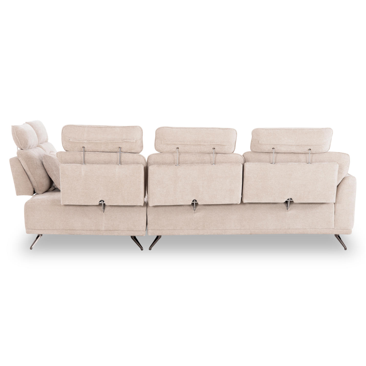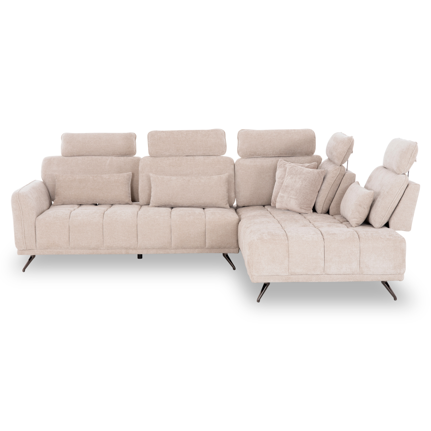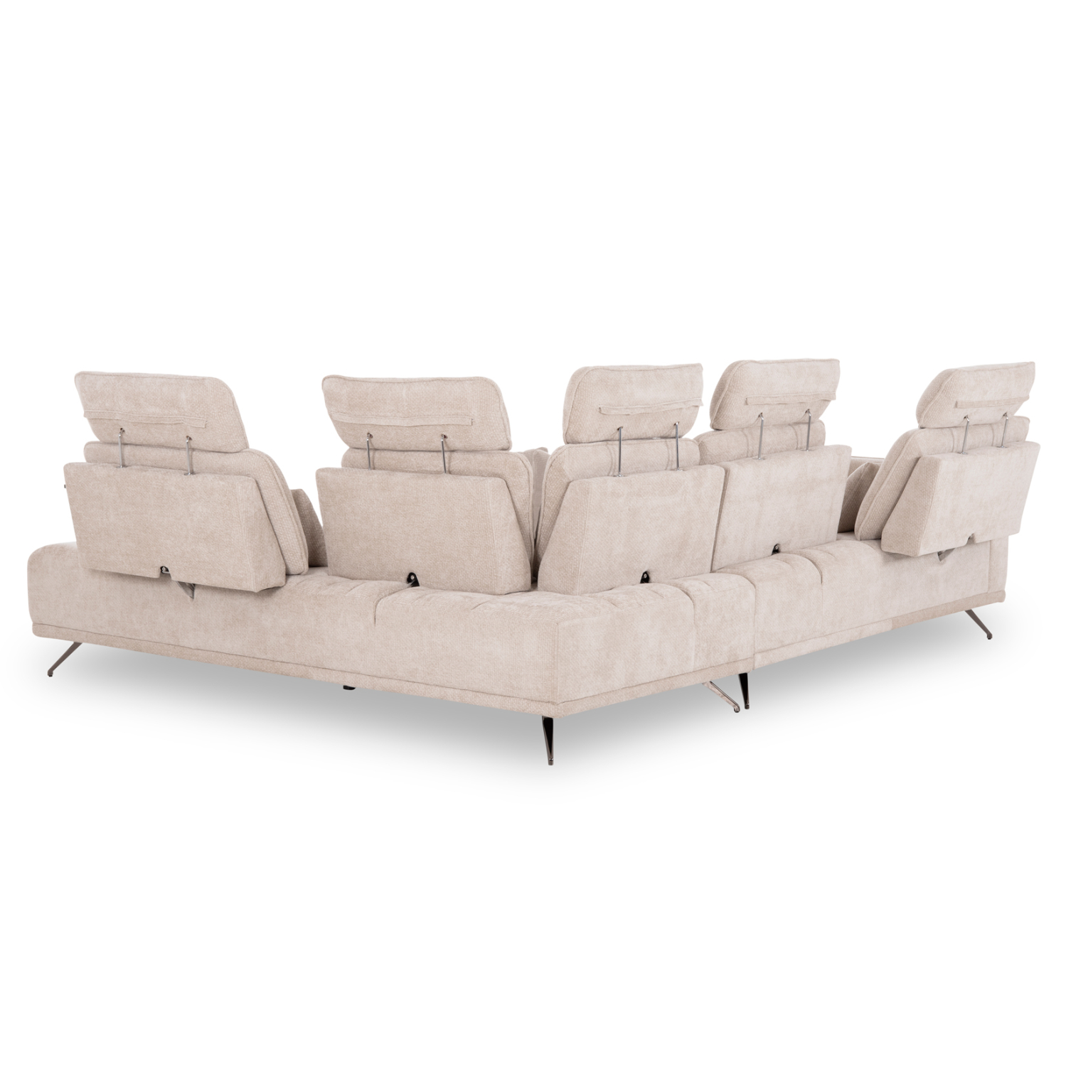Ολόκληρη η επένδυσή του έχει γίνει με ΕΚΡΟΥ ανάγλυφο ύφασμα, ενώ τα πόδια είναι μεταλλικά. Κάθε μία από τις 5 θέσεις διαθέτει κινούμενη πλάτη την οποία κινείτε με υφασμάτινο χερούλι που βρίσκεται στο πίσω μέρος, ενώ διαθέτουν και ξεχωριστό προσκέφαλο. Την υπέροχη εικόνα συμπληρώνουν τα 5 μικρά διακοσμητικά μαξιλαράκια επενδυμένα με ίδιο ύφασμα.