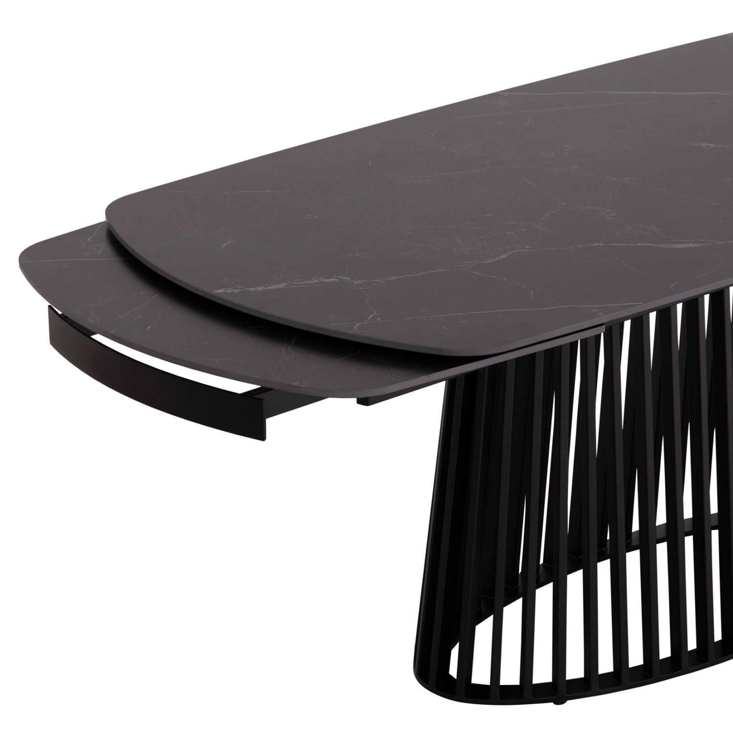 SYMETRON presents the new series of indoor furniture, MEMNON! A series that came to create new standards in the category. With incomparable quality of construction materials, but also a unique finish and assembly process, the MEMNON series will be the reference point in every space. This particular dining table, therefore, wonderfully combines practicality with luxury. It is extendable with easy-to-use extension mechanisms while the tabletop is ceramic with a BLACK MARBLE look! The (powder coated) metal frame and the oval base with the amazing design in BLACK color complete the picture and enhance the luxury that is evident in every inch of this table!