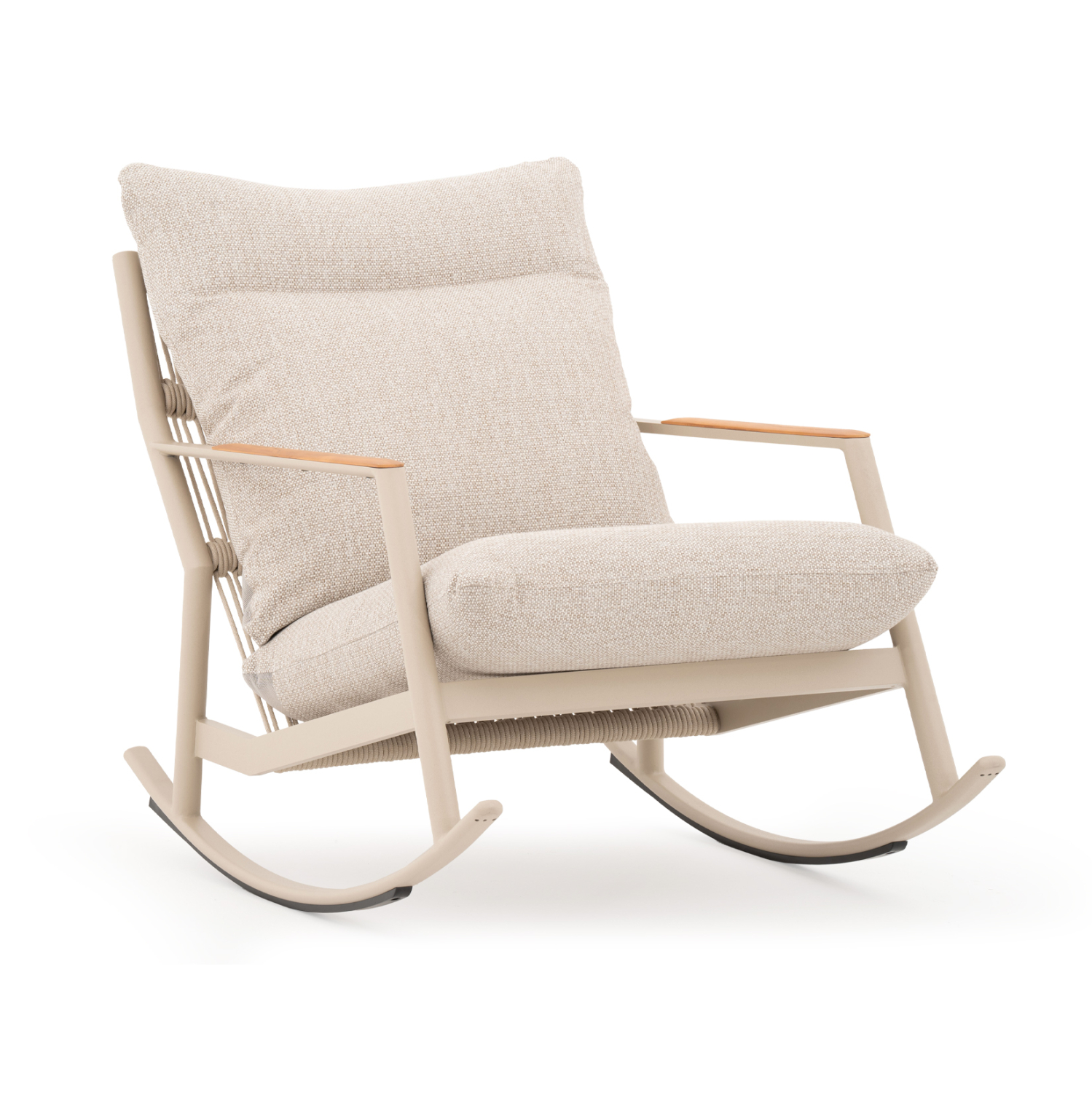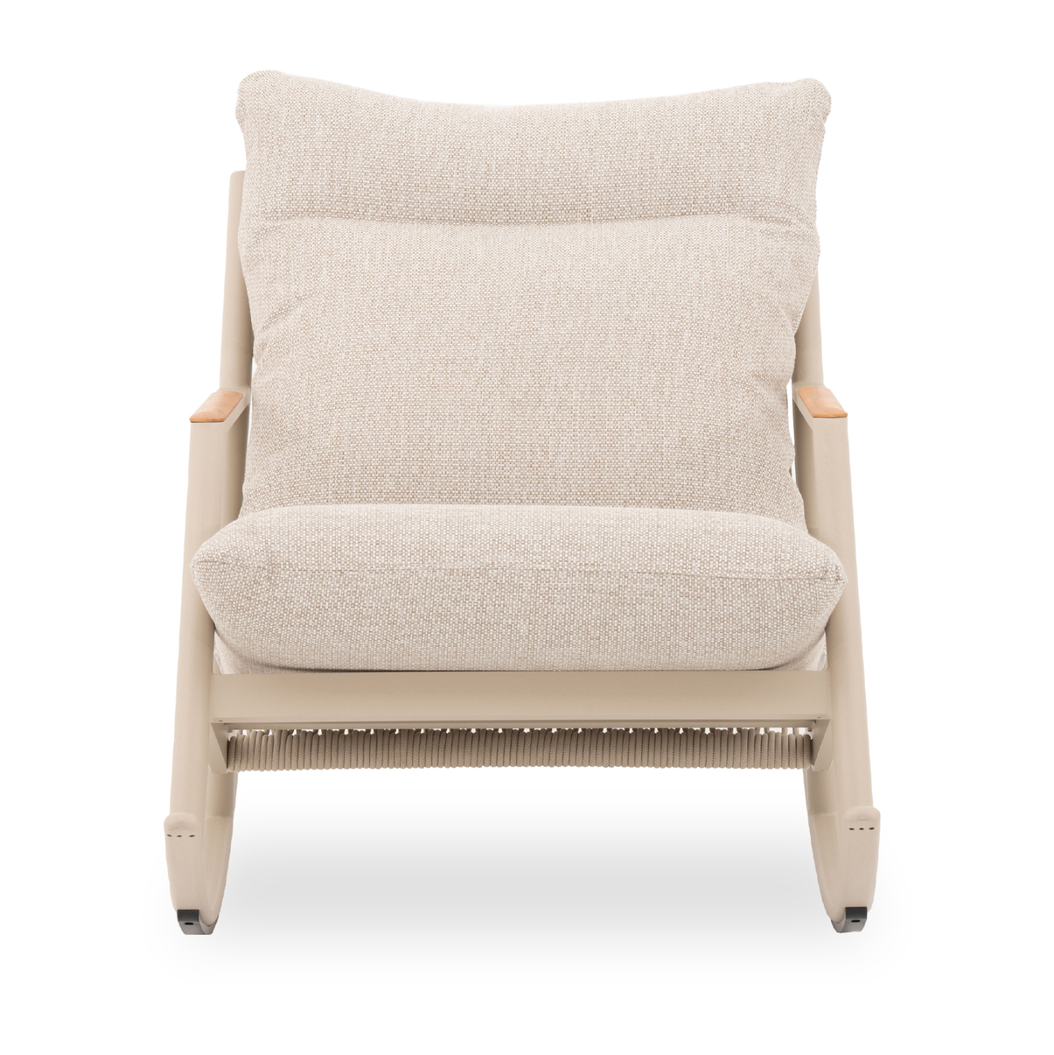 Μια υπέροχη κουνιστή πολυθρόνα που θα σας «ταξιδέψει»! Ο σκελετός είναι από αλουμίνιο σε ΜΠΕΖ χρώμα με σχοινί στην πλάτη σε παρόμοιο χρώμα, ενώ τα μαξιλάρια είναι και αυτά σε ΜΠΕΖ χρώμα. Το ξύλο teak ως επένδυση στα μπράτσα επιτείνει την αίσθηση πολυτέλειας!