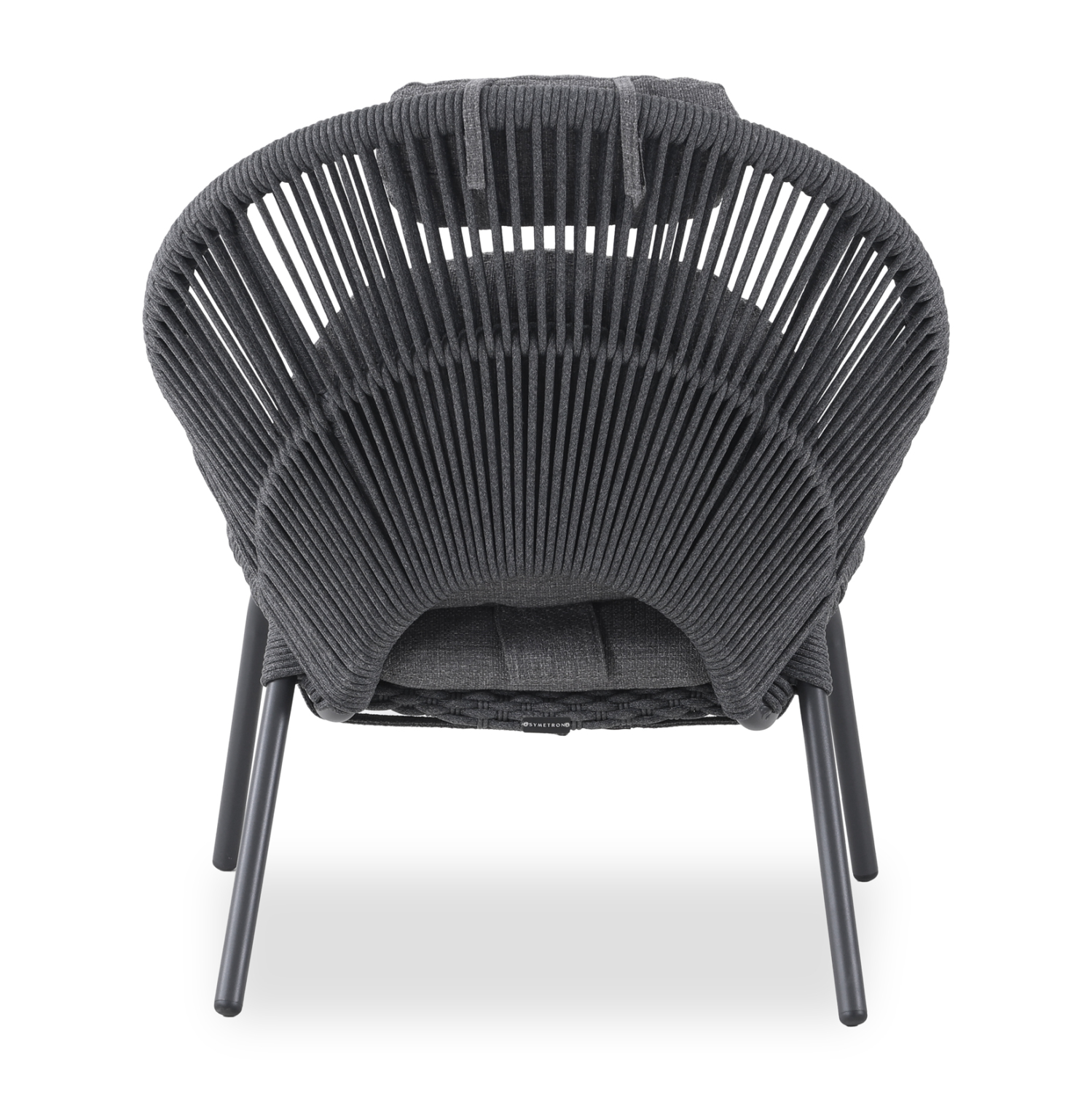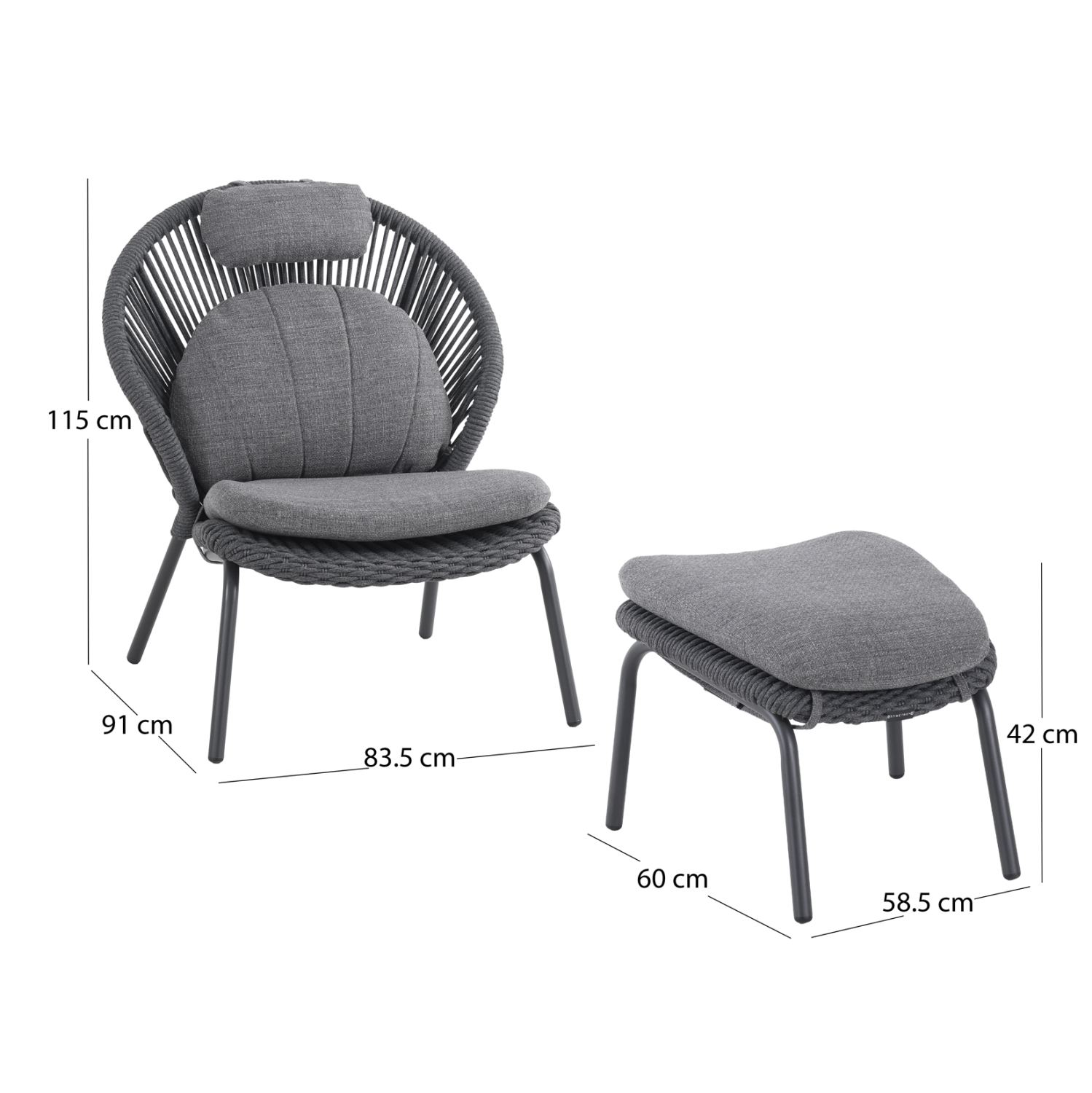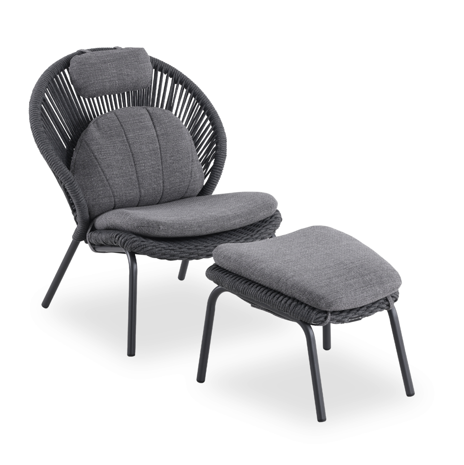 SYMETRON presents the new lounge chair with footrest set TEMPORAL in CHARCOAL color. Made of aluminum and rope as a lining, it exudes luxury and comfort. It stands out for its high back with an independent head cushion and the curved seat, which create a unique image in combination with the same aesthetic footrest!
