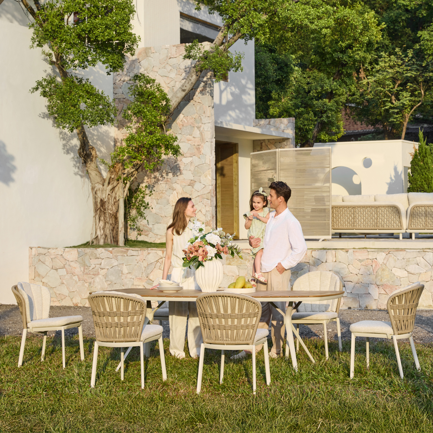 SYMETRON presents the new dining chair GOFFEN. Made of aluminum, it is lightweight, ideal for outdoor spaces. The curved back of the chair is made of braided rope and has cushions on both the seat and back. The color of the frame is Ivory, while the rope is in natural color and the cushion covers are BEIGE.