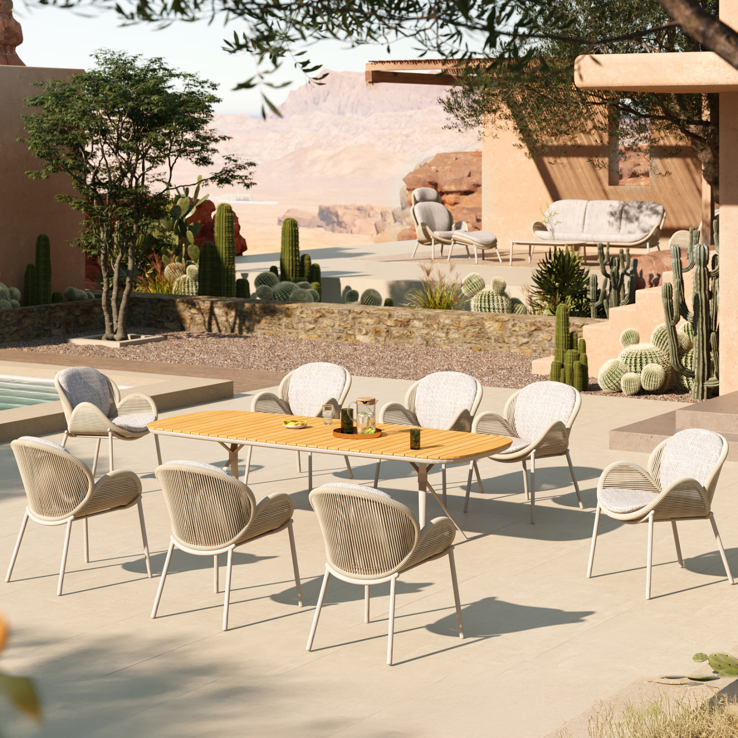 SYMETRON presents the new dining chair RIVEN. Made of aluminum and rope as a lining, it exudes luxury and comfort. The color of the chair is IVORY, while the rope is natural color and the covers of the cushions are BEIGE. It stands out for its noticeably curved seat that creates a unique image but also offers a comfortable seating feeling!