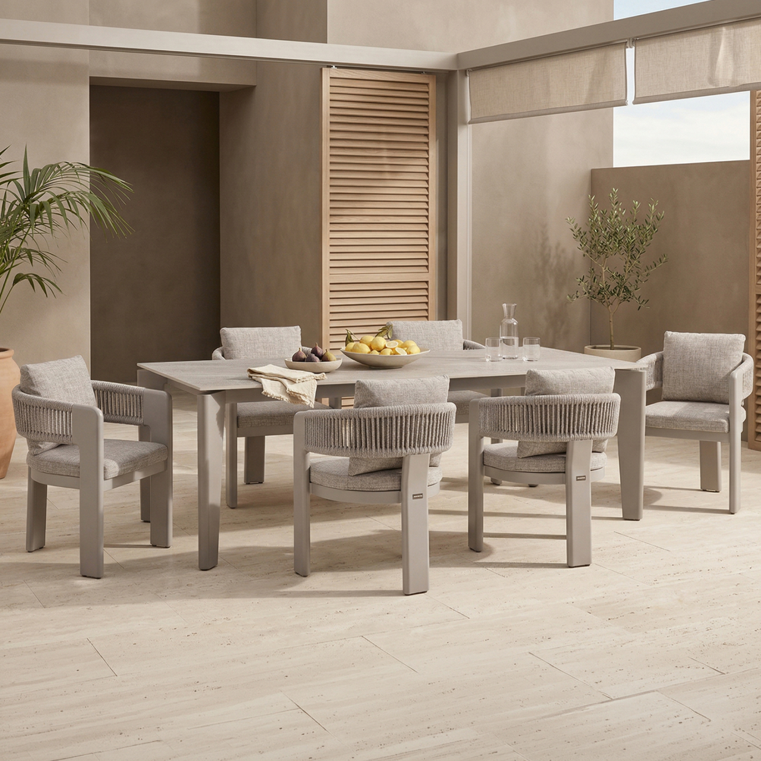 Η SYMETRON παρουσιάζει το σετ τραπεζαρίας εξωτερικού χώρου 6 θέσεων CERRIG. Ένα εξαιρετικό και με μοντέρνο design σετ στις ανοιχτές αποχρώσεις του ΜΠΕΖ, που αποτελείται από ένα ορθογώνιο τραπέζι τραπεζαρίας με σκελετό αλουμινίου και επιφάνεια από Sintered Stone, και 6 πανέμορφες πολυθρόνες τραπεζαρίας από αλουμίνιο με επένδυση από σχοινί και καλύμματα στα μαξιλάρια από υπέροχο ύφασμα OLEFIN!