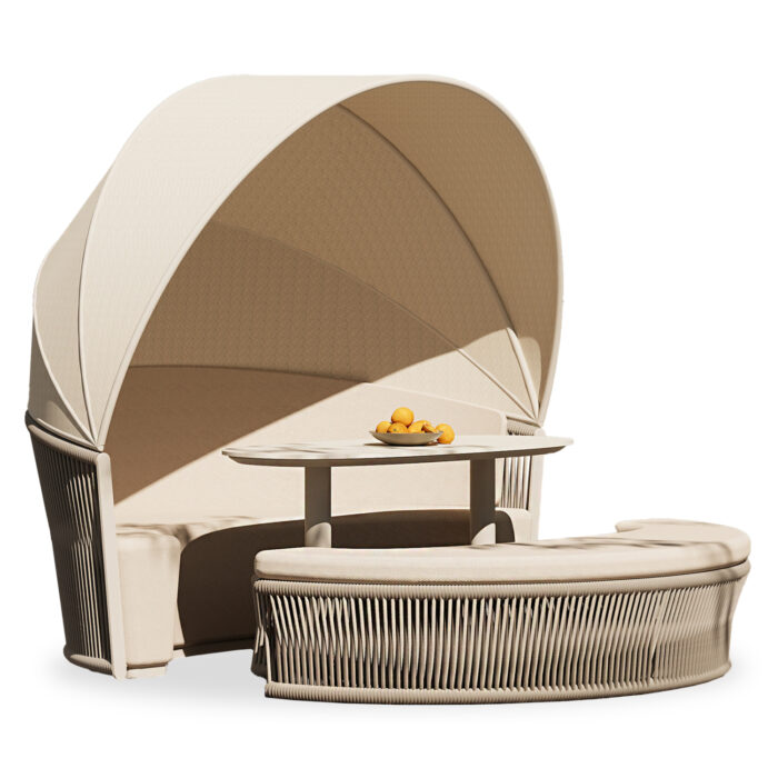 Η SYMETRON παρουσιάζει την επιτομή της σύγχρονης χαλάρωσης και της έξυπνης διαβίωσης – το LORIEN Round Daybed. Δεν είναι απλώς ένα daybed. Είναι το νέο σας αγαπημένο σημείο για να χαλαρώσετε. Αυτό το καινοτόμο στρογγυλό daybed διαθέτει ευέλικτο σχεδιασμό τριών τεμαχίων, με επίκεντρο ένα μοναδικό πτυσσόμενο (σε ύψος) τραπέζι. Το daybed αποτελείται από δύο μεγαλύτερα καμπυλωτά τμήματα καθισμάτων που σχηματίζουν έναν άνετο κυκλικό χώρο χαλάρωσης. Στο κέντρο βρίσκεται το τραπέζι (lift top), το οποίο μπορεί να ανυψωθεί για φαγητό, εργασία ή τοποθέτηση ποτών. Όταν χαμηλώνει, το τραπέζι κάθεται στο ίδιο επίπεδο με τα καθίσματα, επιτρέποντας την τοποθέτηση ενός μαξιλαριού από πάνω – μετατρέποντας άψογα τα 3 κομμάτια σε ένα ομοιόμορφο, κυκλικό daybed, ιδανικό για κάθε χρήση που εσείς θέλετε. Τέλος, το daybed διαθέτει και πτυσσόμενο σκίαστρο που ολοκληρώνει την εικόνα αυτού του όμορφου daybed!