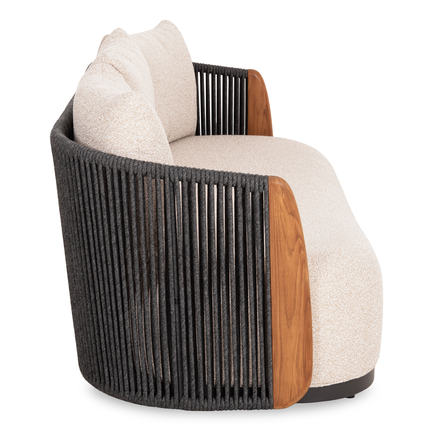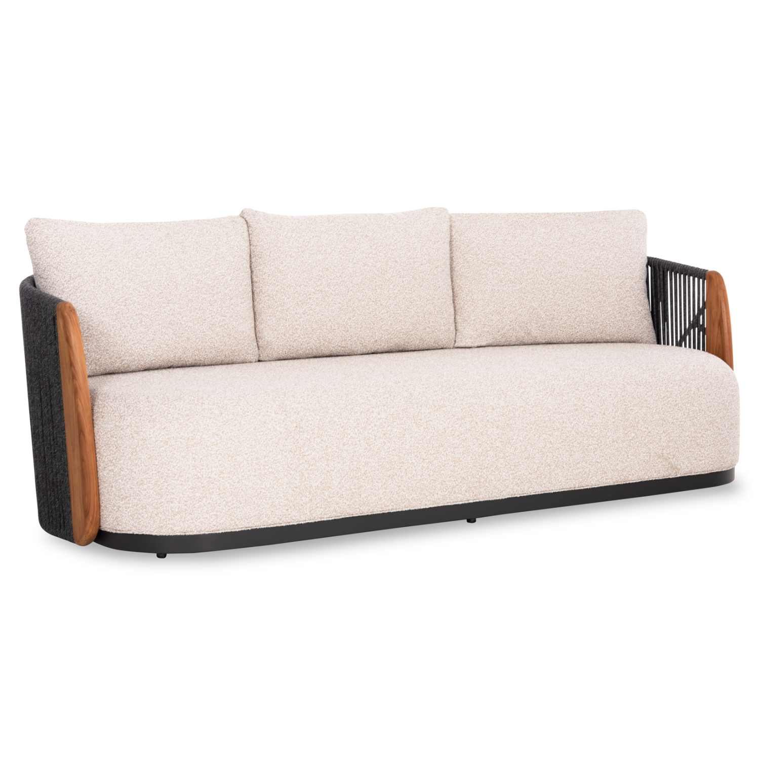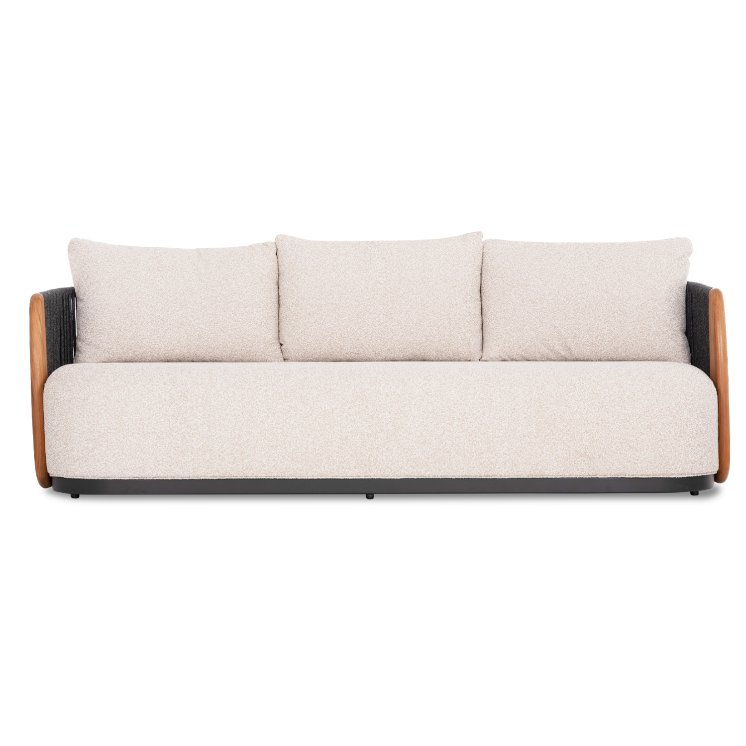 Η σειρά AUGUSTUS, όπως και οι υπόλοιπες της SYMETRON, συνδυάζει την απαράμιλλη ποιότητα των υλικών της και του φινιρίσματός της, αλλάζοντας τα δεδομένα στην κατηγορία. Αυτός ο 3-θέσιος καναπές για τον εξωτερικό χώρο έχει σκούρο ΓΚΡΙ σκελετό αλουμινίου ενώ τα 3 μαξιλάρια της πλάτης αλλά και το κάθισμα έχουν επένδυση από OLEFIN ύφασμα σε ΜΠΕΖ χρώμα. Η επένδυση του σκελετού με το επίσης σκούρο γκρι σχοινί είναι άλλη μία πινελιά πολυτέλειας, όπως και το κάθετο τμήμα των μπράτσων που είναι κατασκευασμένα από ξύλο TEAK.