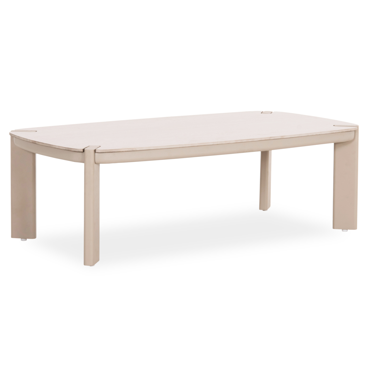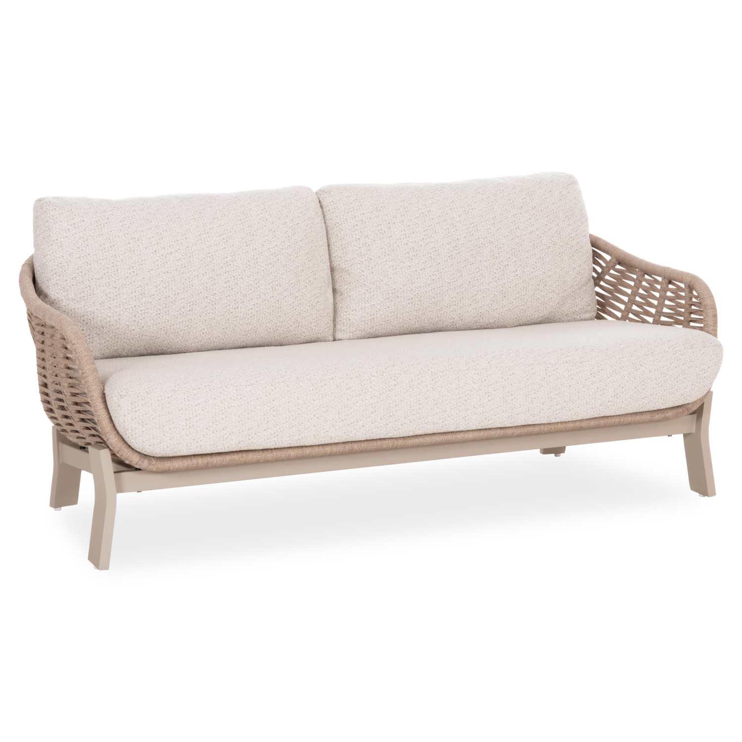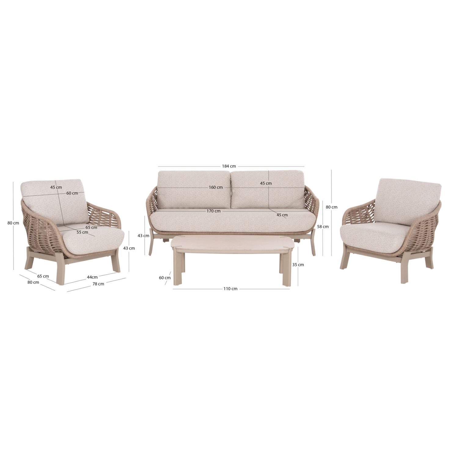 The set consists of 2 armchairs and a 3-seater sofa, as well as a rectangular coffee table with rounded corners. The set is made of aluminum, flat rope and cushions in BEIGE color, while the tabletop is made of Sintered Stone in a slightly lighter shade.