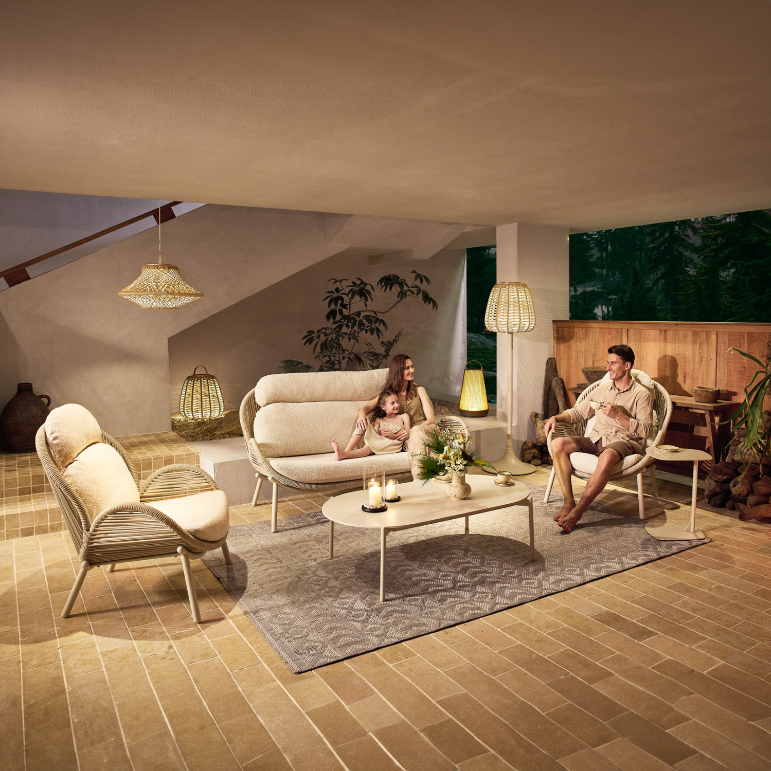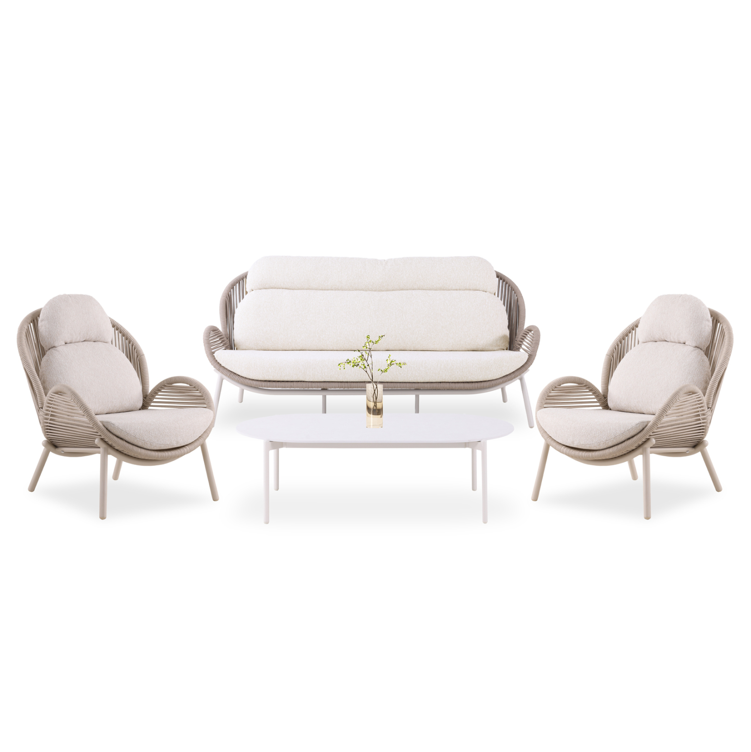 SYMETRON presents the new outdoor lounge set of the RIVEN series. It consists of two comfortable lounge armchairs, a 3-seater sofa and a coffee table with an oval tabletop made of sintered stone in the color Urano Ivory. The armchairs, the sofa and the coffee table have an aluminum frame, while the rope upholstery exudes luxury and comfort. The color of the frame is IVORY (cream white), while the rope is in a natural color and the covers of the comfortable cushions in BEIGE. A unique set that will upgrade any outdoor space!