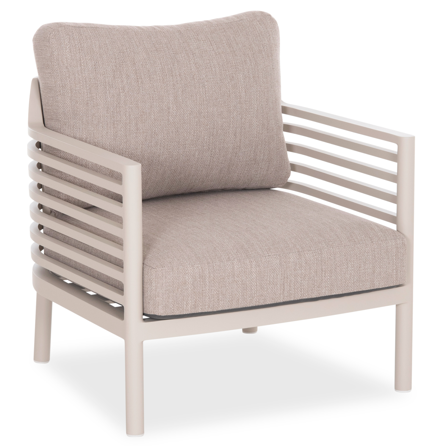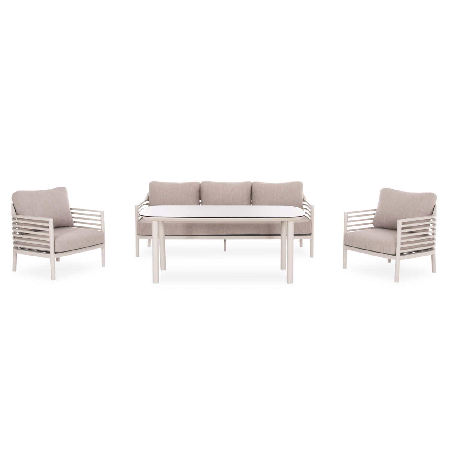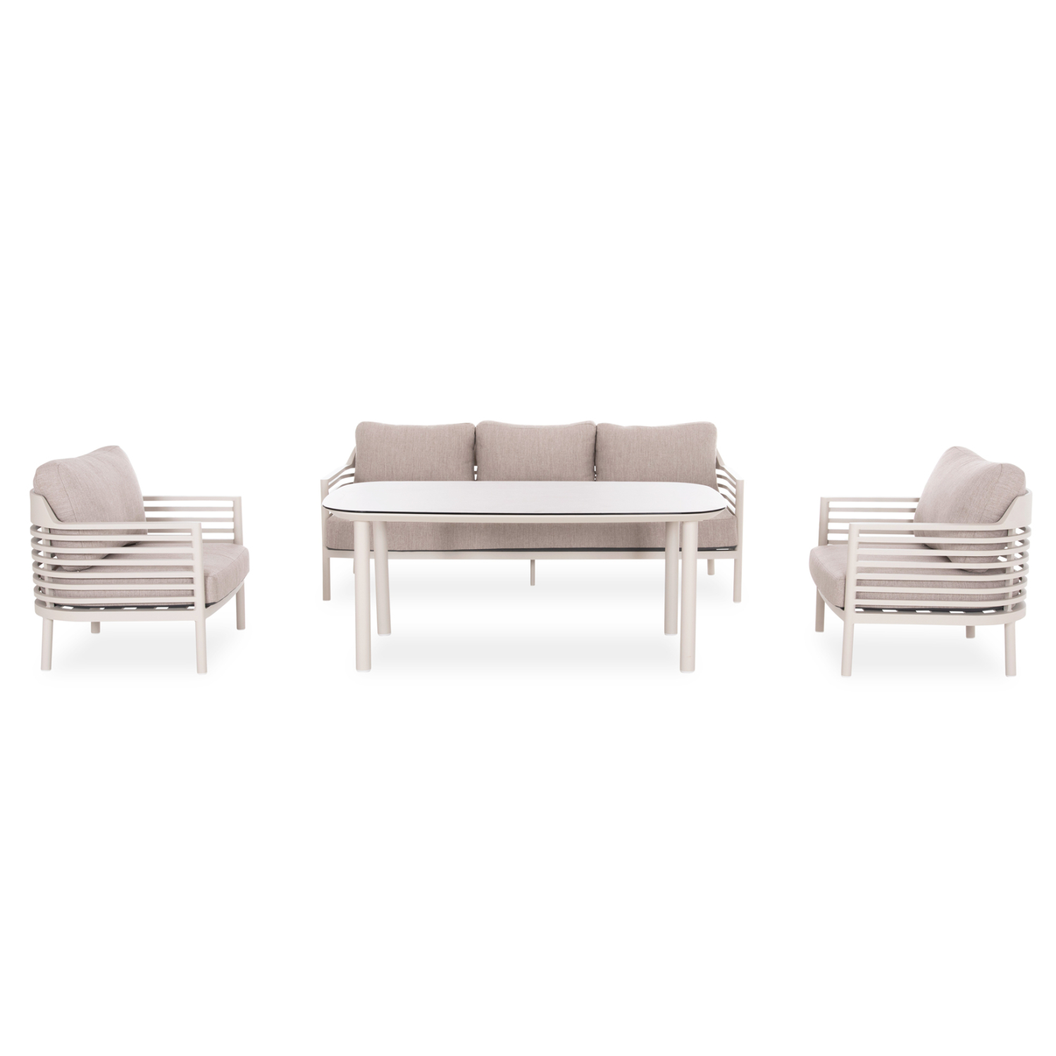 Welcome the new WALES outdoor lounge set. It consists of a 3-seater sofa, two wonderful armchairs, and a rectangular table that differs from the rest due to its intermediate height! The frame is made of aluminum in CREAM WHITE color with cushions in BEIGE color, while the tabletop made of 3D printed glass in LIGHT GREY color showcases the quality of the whole composition!