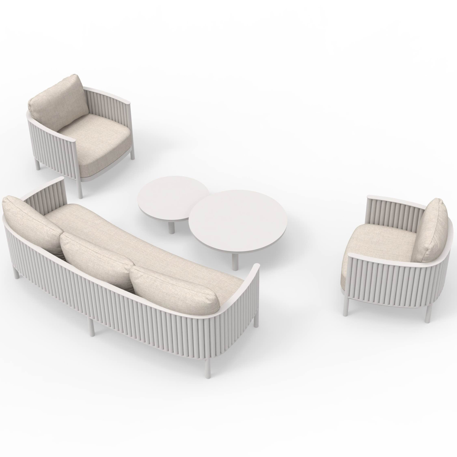 It consists of a 3-seater sofa, two wonderful armchairs, and two round coffee tables at different heights! Their frame is made of aluminum in CREAM WHITE color as are the tabletops of the coffee tables, while the cushions are in BEIGE color.