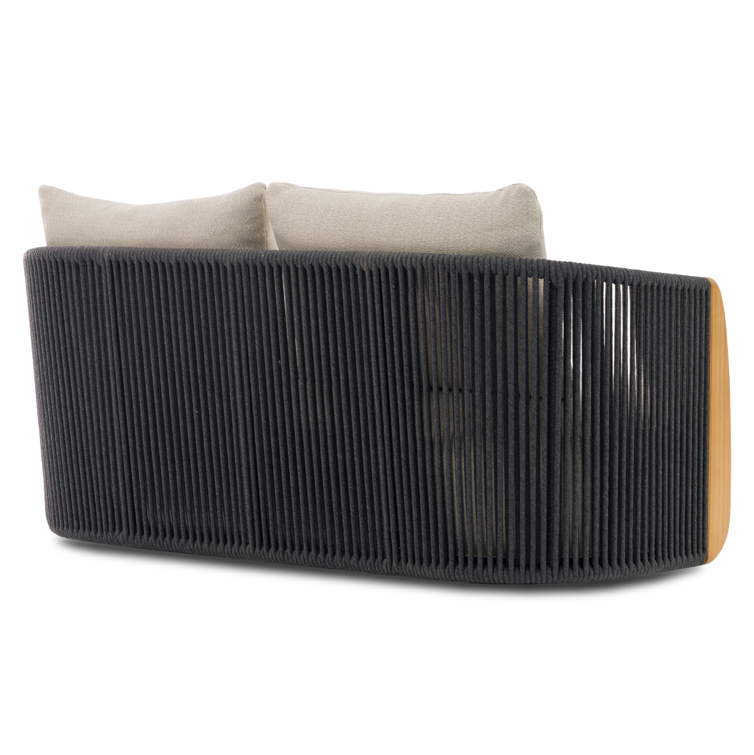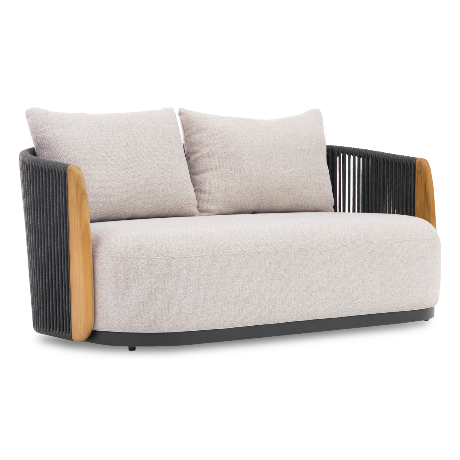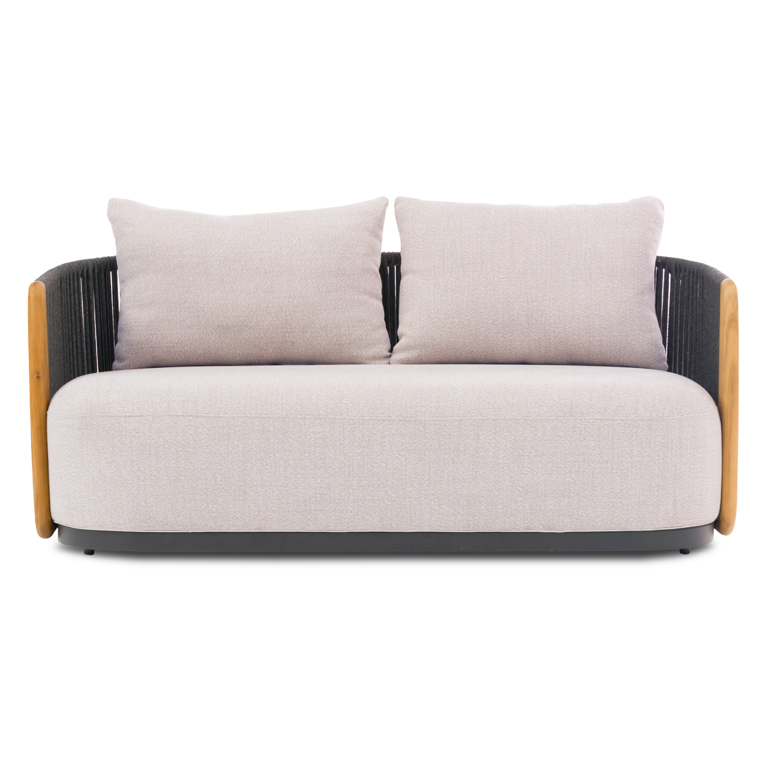The AUGUSTUS series, like the rest of SYMETRON, combines the unparalleled quality of its materials with detailed finish, changing the “landscape” in the category. This 4-piece, 4-seater set consists of a two-seater sofa, 2 lounge armchairs and an oval coffee table with a BEIGE sintered stone tabletop. The sofa and armchairs have a dark GREY aluminum frame and rope, while the back cushions and seats are upholstered in BEIGE OLEFIN fabric. The teak wood on the vertical part of the armrests is an additional touch of luxury to the entire set.