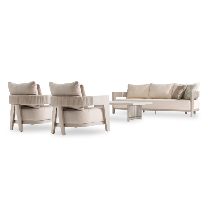 Το σετ σαλόνι εξωτερικού χώρου 4τμχ ABSOLUTION είναι η τελευταία προσθήκη στην γκάμα των πολυτελών σετ της SYMETRON. Αποτελείται από 2 φαρδιές και αναπαυτικές πολυθρόνες με παχύ μαξιλάρι καθίσματος και μαξιλάρι πλάτης, έναν 3-θέσιο καναπέ παρόμοιας αισθητικής, και ένα ορθογώνιο τραπεζάκι μέσης. Οι πολυθρόνες, ο καναπές και το τραπεζάκι έχουν σκελετό αλουμινίου και διακόσμηση με σχοινί, όλα σε όμορφο ΜΠΕΖ χρώμα, όπως και τα καλύμματα στα μαξιλάρια. Και πάντα με την ασφάλεια στην ποιότητα που παρέχει η SYMETRON!