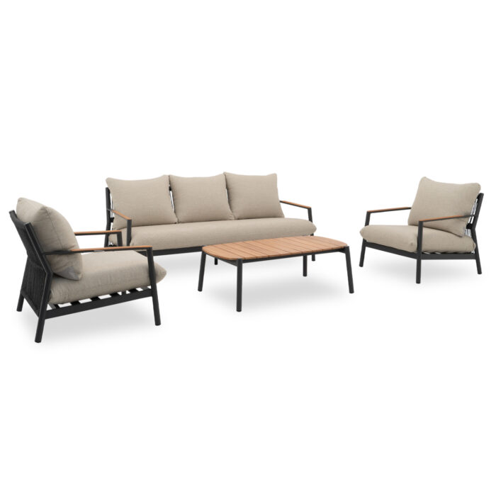 Αποτελείται από έναν 3-θέσιο καναπέ, δύο υπέροχες πολυθρόνες, και ένα ορθογώνιο τραπεζάκι! Ο σκελετός τους είναι από αλουμίνιο σε ΑΝΘΡΑΚΙ χρώμα με σχοινί στην πλάτη σε παρόμοιο χρώμα, ενώ τα μαξιλάρια είναι σε ΜΠΕΖ χρώμα. Το ξύλο teak στην επιφάνεια του τραπεζιού αλλά και ως επένδυση στα μπράτσα του καναπέ και στις πολυθρόνες επιτείνει την αίσθηση πολυτέλειας!