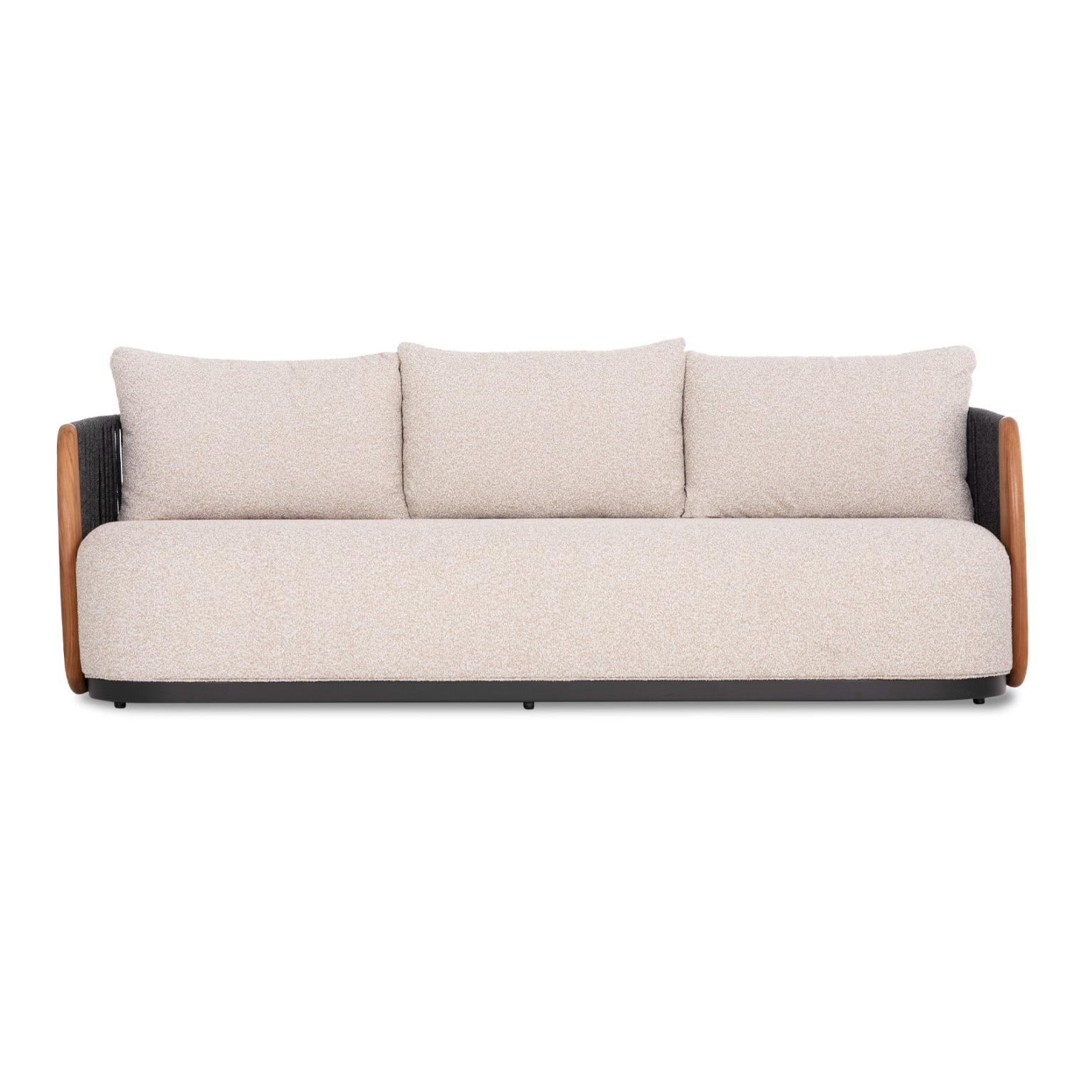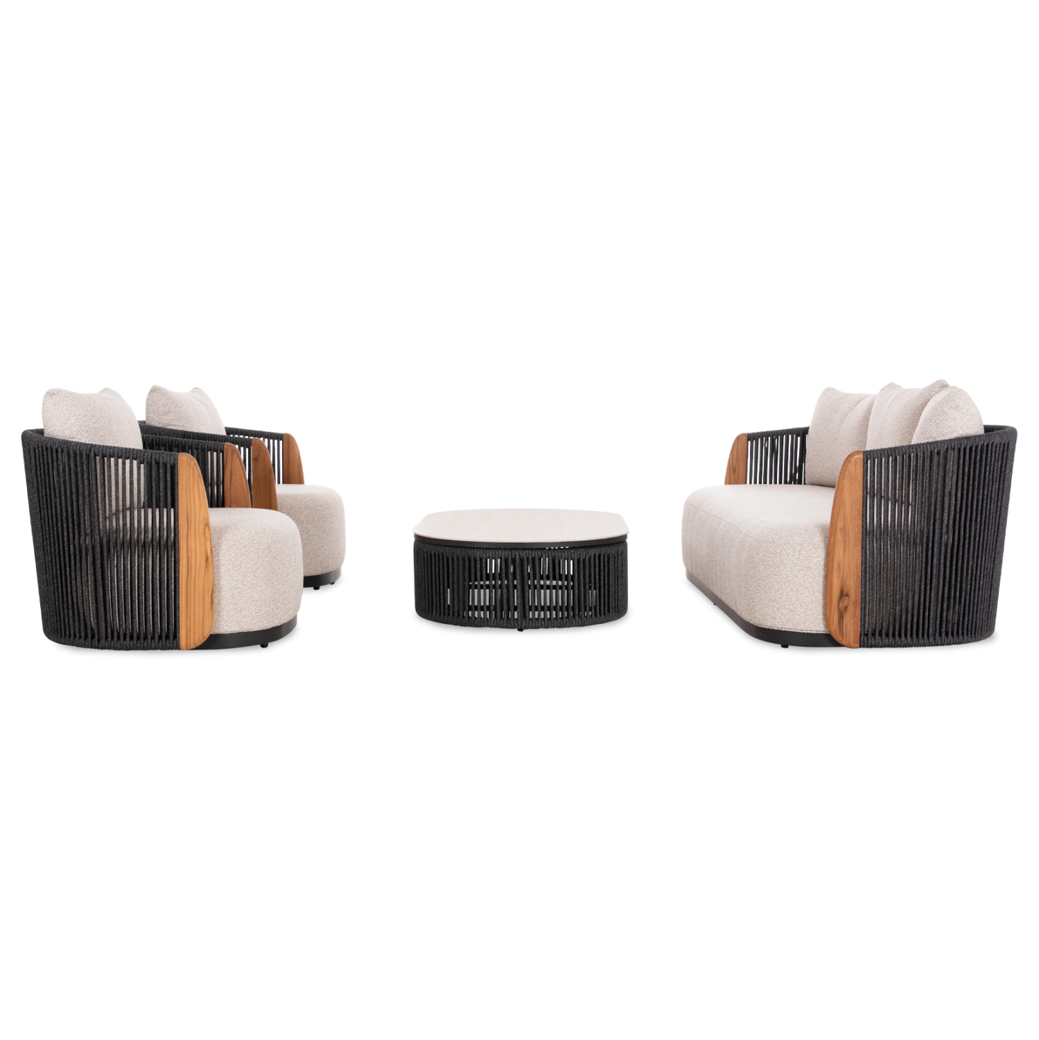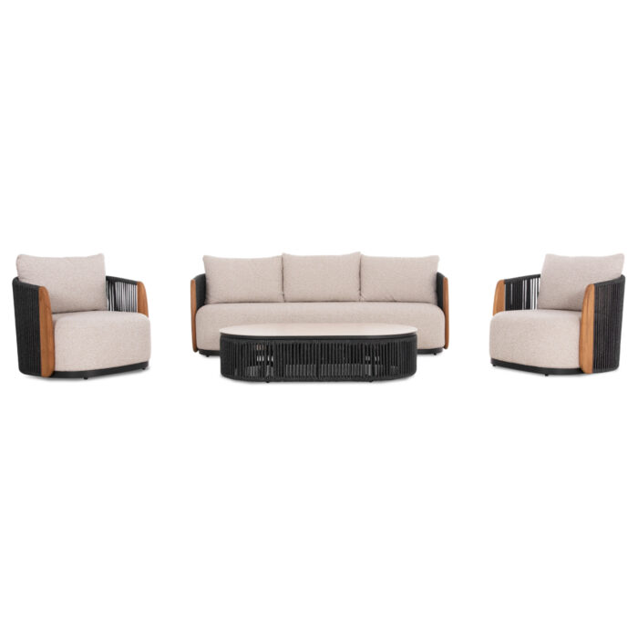 The AUGUSTUS series, like the rest of SYMETRON, combines the unparalleled quality of its materials with detailed finish, changing the “landscape” in the category. This 4-piece, 5-seater set consists of a two-seater sofa, 2 lounge armchairs and an oval coffee table with a BEIGE sintered stone tabletop. The sofa and armchairs have a dark GREY aluminum frame and rope, while the back cushions and seats are upholstered in BEIGE OLEFIN fabric. The teak wood on the vertical part of the armrests is an additional touch of luxury to the entire set.