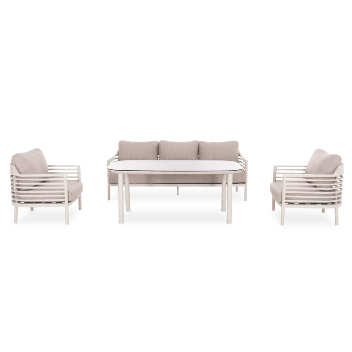 Υποδεχτείτε το νέο σαλόνι εξωτερικού χώρου WALES. Αποτελείται από έναν 3-θέσιο καναπέ, δύο υπέροχες πολυθρόνες, και ένα ορθογώνιο τραπέζι που διαφέρει από τα υπόλοιπα λόγω του ενδιάμεσου ύψους του! Ο σκελετός είναι από αλουμίνιο σε ΚΡΕΜ χρώμα με μαξιλάρια σε ΜΠΕΖ χρώμα, ενώ το top στο τραπέζι από 3D printed γυαλί σε ΑΝΟΙΧΤΟ ΓΚΡΙ χρώμα απογειώνει ποιοτικά όλη την σύνθεση!