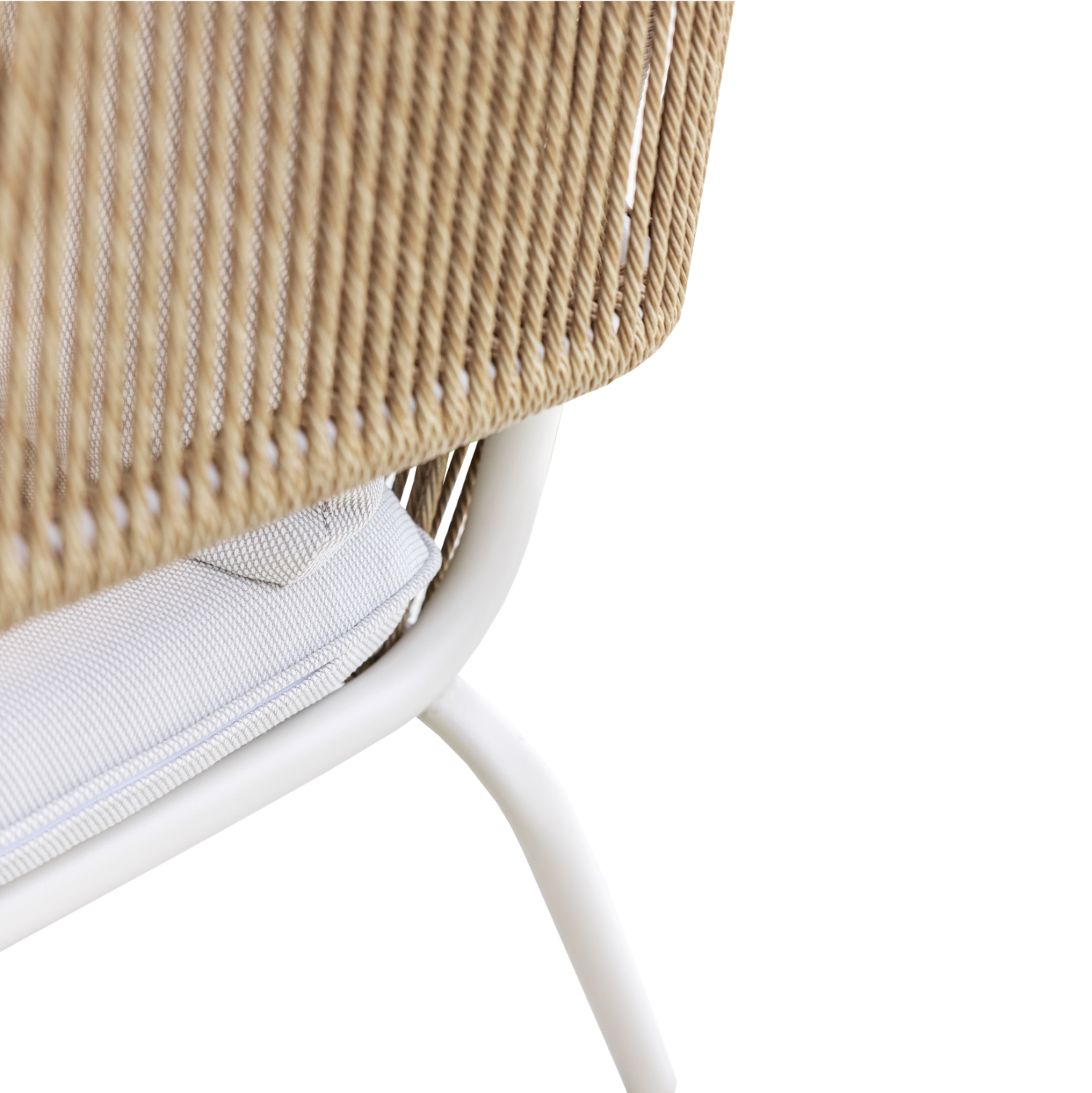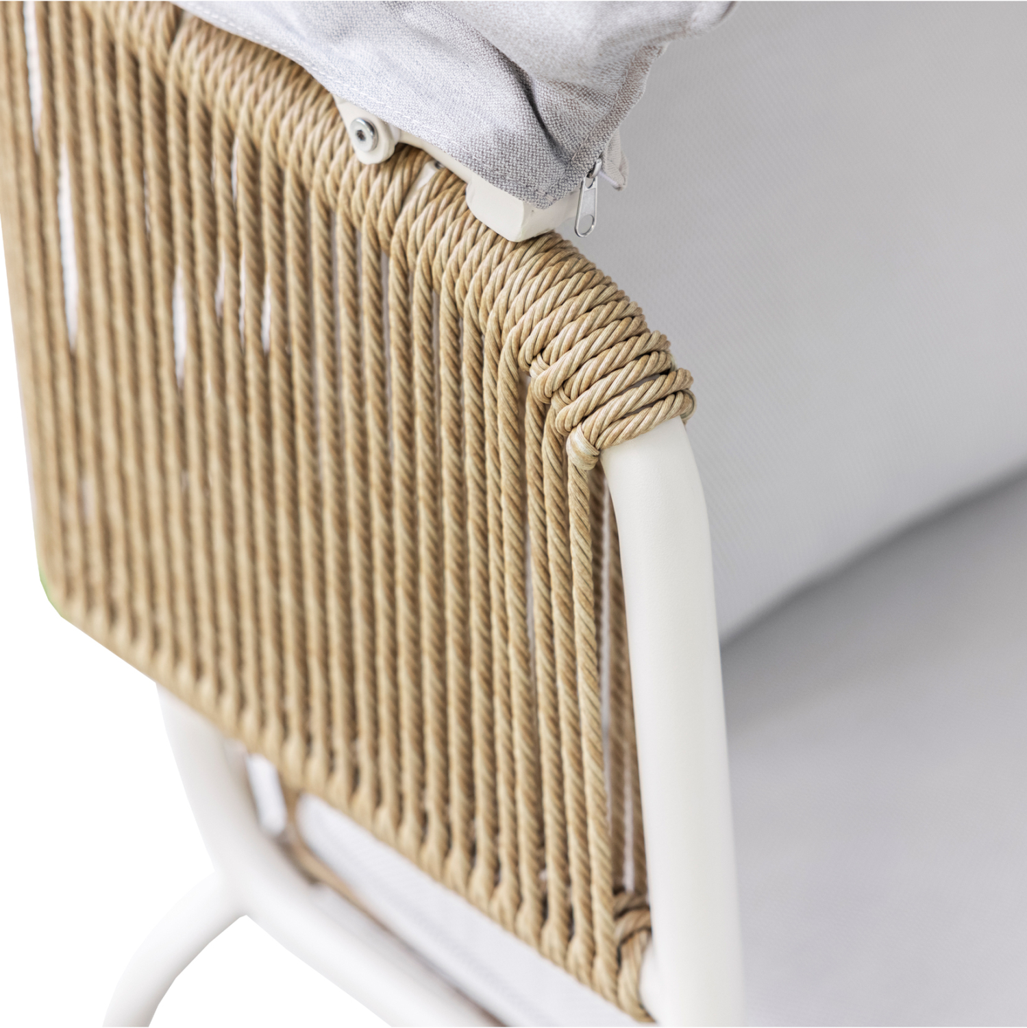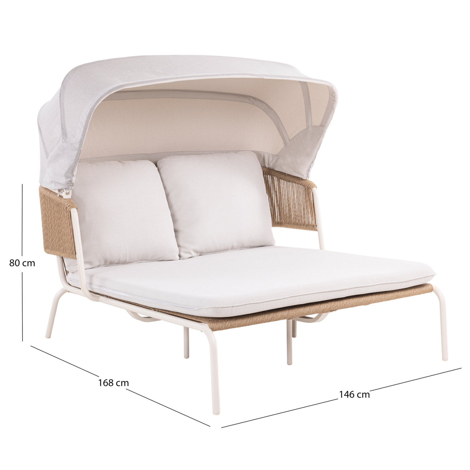 We present to you the luxurious and wonderful SANCTUM aluminum daybed, which raises the bar of quality and aesthetics that we offer to you, both for the home and for any professional space! With unparalleled quality of construction and materials, it will upgrade the image in any space you wish. The frame with high legs is in IVORY color, while the arms and back are upholstered with rattan in wicker weave. However, what makes it stand out from the rest of the daybeds is the shade in WHITE color, making it ideal for your outdoor space!