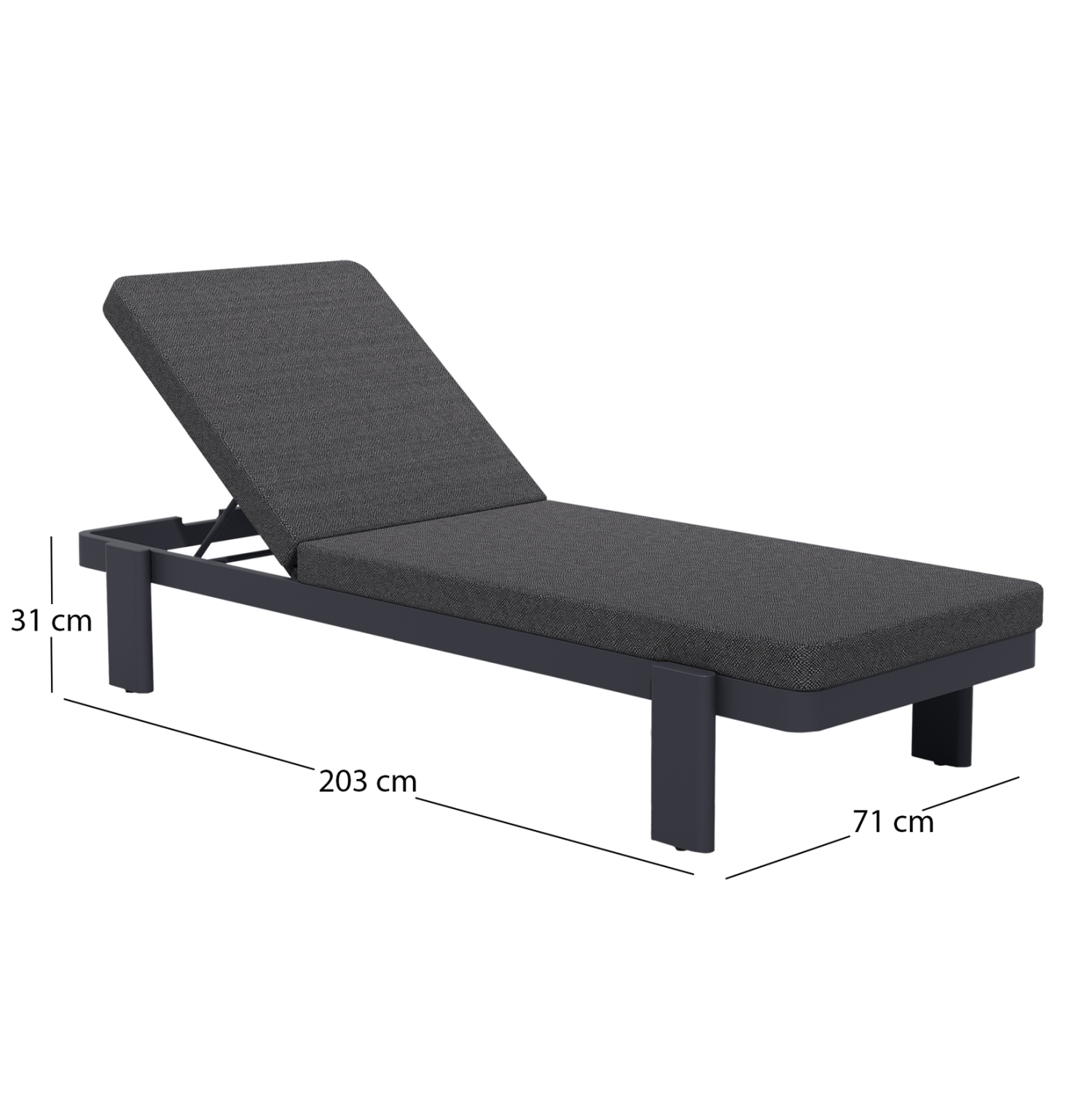 Η ξαπλώστρα είναι κατασκευασμένη από αλουμίνιο σε χρώμα ΣΚΟΥΡΟ ΓΚΡΙ, και συνοδεύεται από μαξιλάρι (στρώμα) με κάλυμμα OLEFIN σε παρόμοιο χρώμα.