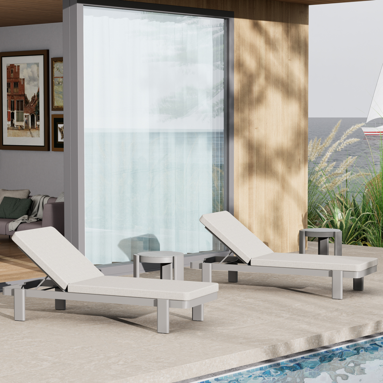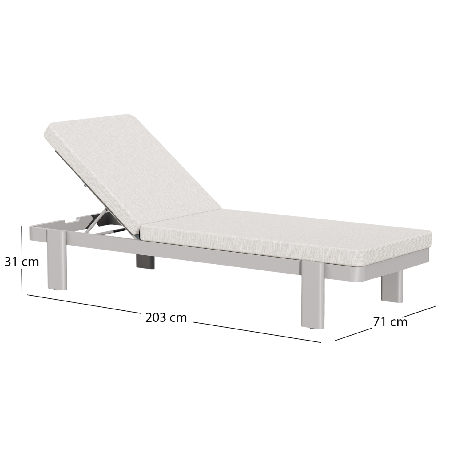 Η ξαπλώστρα είναι κατασκευασμένη από αλουμίνιο σε χρώμα ΚΡΕΜ, και συνοδεύεται από μαξιλάρι (στρώμα) με κάλυμμα OLEFIN σε χρώμα ανοιχτό ΜΠΕΖ.