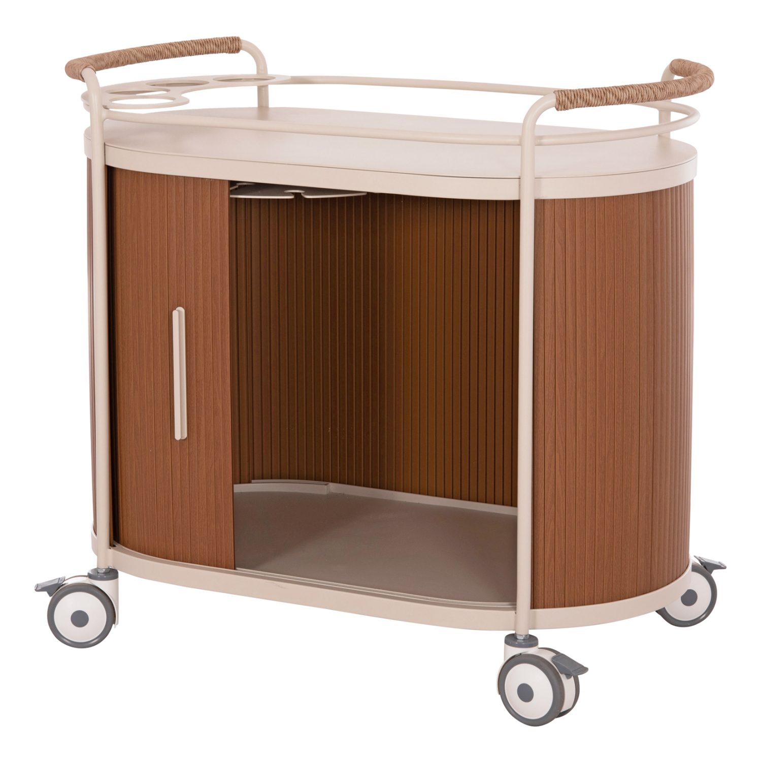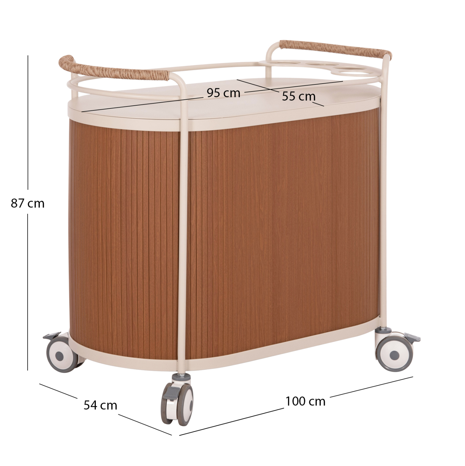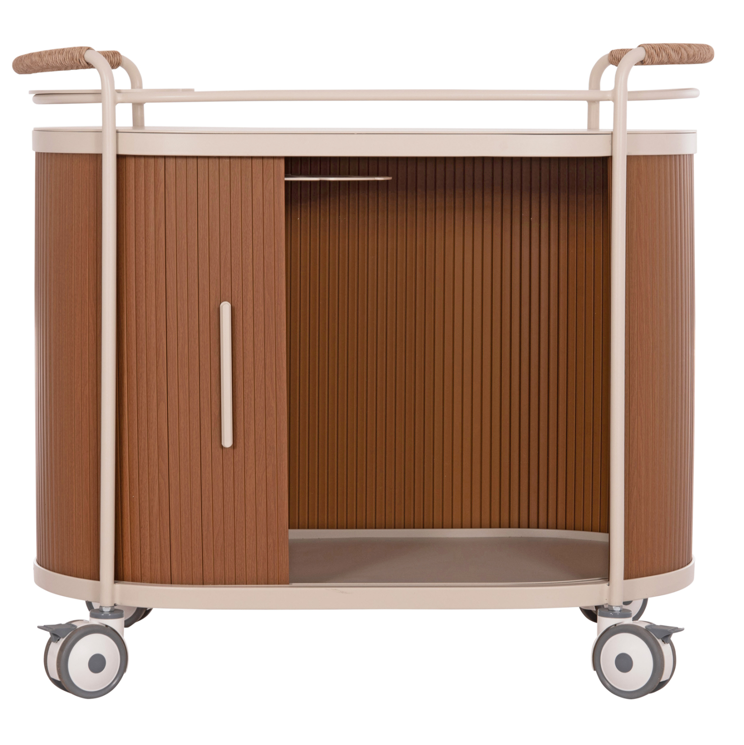 SYMETRON brings the DESTINY series buffet/trolley and upgrades your professional space. It has an aluminum frame in IVORY color, and a sliding door in SAND BEIGE color. Inside the trolley there is a shelf that divides the space into 2 levels. The top is made of sintered stone in ivory color as well, while the carrying handles are covered with P.E.wicker. Finally, the wheels have a stop mechanism, while the rolling quality is exemplary.