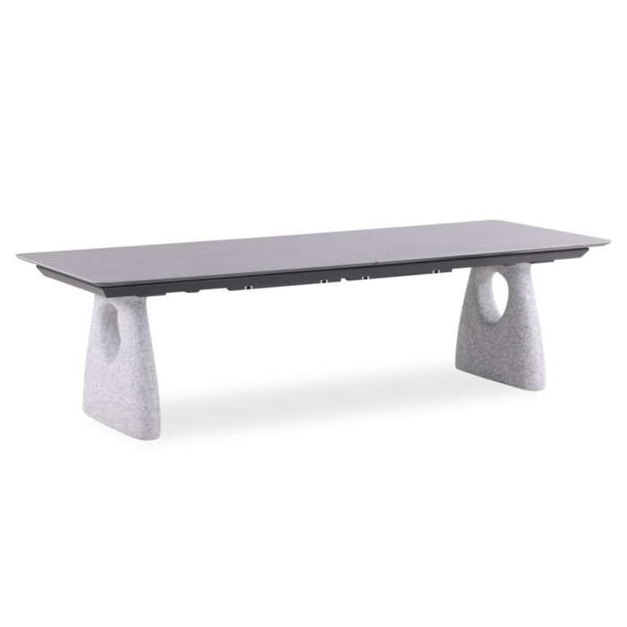We present to you the “GOFFEN”. An impressive rectangular extendable outdoor dining table in a large dimension (it can extend to 4 meters in length) with an aluminum frame in CHARCOAL color. SYMETRON raises the bar of quality and aesthetics that we offer to you, both for the home and for any professional space! With unparalleled quality of construction and materials, it will upgrade the image in any space you wish. This table stands out with its unique tabletop made of SINTERED STONE 6mm in dark GREY color and of course the legs of the table that are made of F.R.P. “rock” in grey color!
